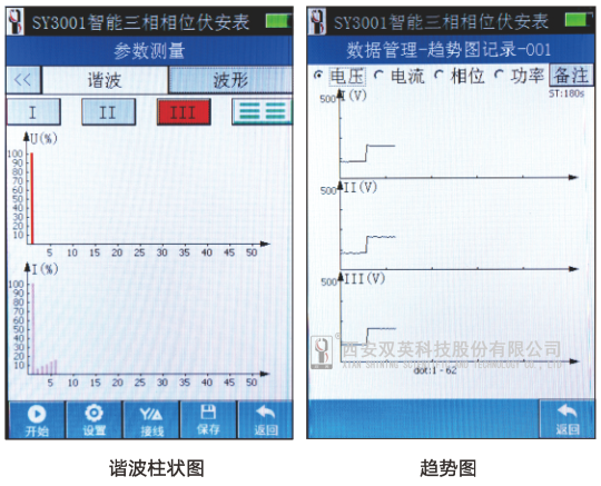 SY3001C智能三相相位伏安表:可用于交流電壓、電流幅值及相位、功率、功率因數(shù)、波形、諧波和頻譜等電參數(shù)測(cè)量,并以向量圖或者表格方式等顯示,支持TF卡大容量數(shù)據(jù)存儲(chǔ),帶有藍(lán)牙和USB接口,可以連接智能手機(jī),通過手機(jī)實(shí)時(shí)顯示測(cè)量結(jié)果,并通過手機(jī)APP擴(kuò)展更多功能,可實(shí)時(shí)共享至微信或QQ好友;測(cè)量范圍:0-500V、0-10A,精度:電壓0.2級(jí),電流0.5級(jí),相位:±1.0°,測(cè)相范圍:電流1mA-5A、電壓3V-500V
